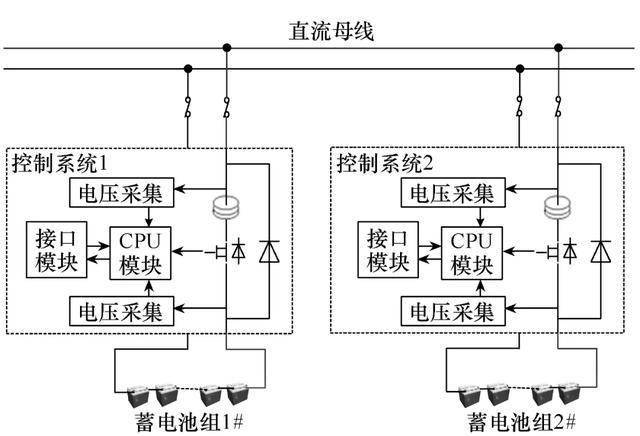 將并聯保護器連接至直流屏及蓄電池組之間,由直流屏提供直流輸入,由并聯保護器控制蓄電池組的充電電壓及充電電流。每組電池配備相應的控制系統進行獨立的充放電管理。為保證在外部交流供電異常時,使蓄電池組能夠及時對負載進行供電,在蓄電池與直流母線之間的連接采用單向器件直接連接,以避免放電環流的影響。