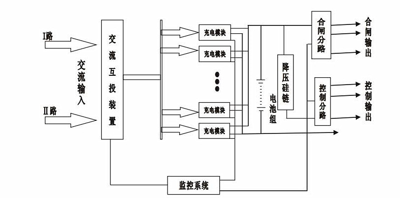 常規直流屏首要由溝通配電模塊、充電模塊、配電監控模塊、降壓硅鏈等零件構成。如圖1為典型的直流屏結構體系。