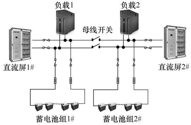 以220kV變電站直流屏體系為例,傳統的裝備為直流屏1#接蓄電池組1#,直流屏2#接蓄電池組2#,直流母線之間由開關操控,在呈現異常或保護進程中互為后備電源,其裝備如圖1所示。